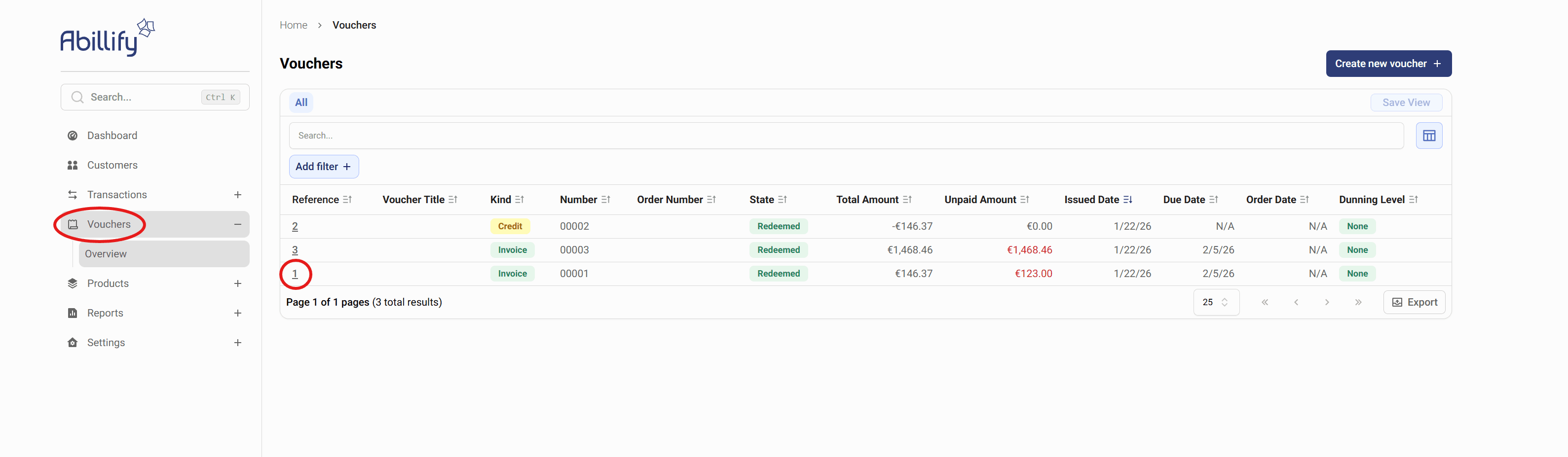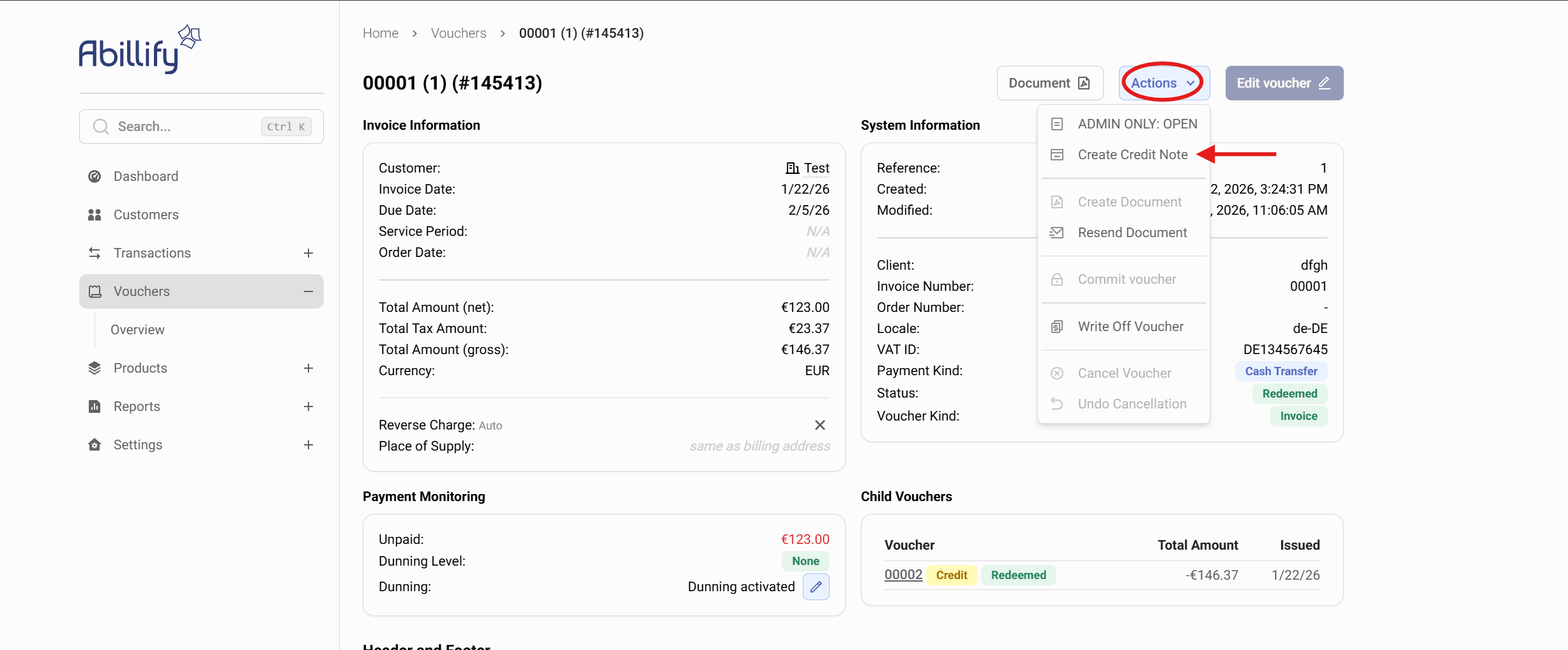 After clicking Create Credit Note, you are redirected to the Create new voucher page.