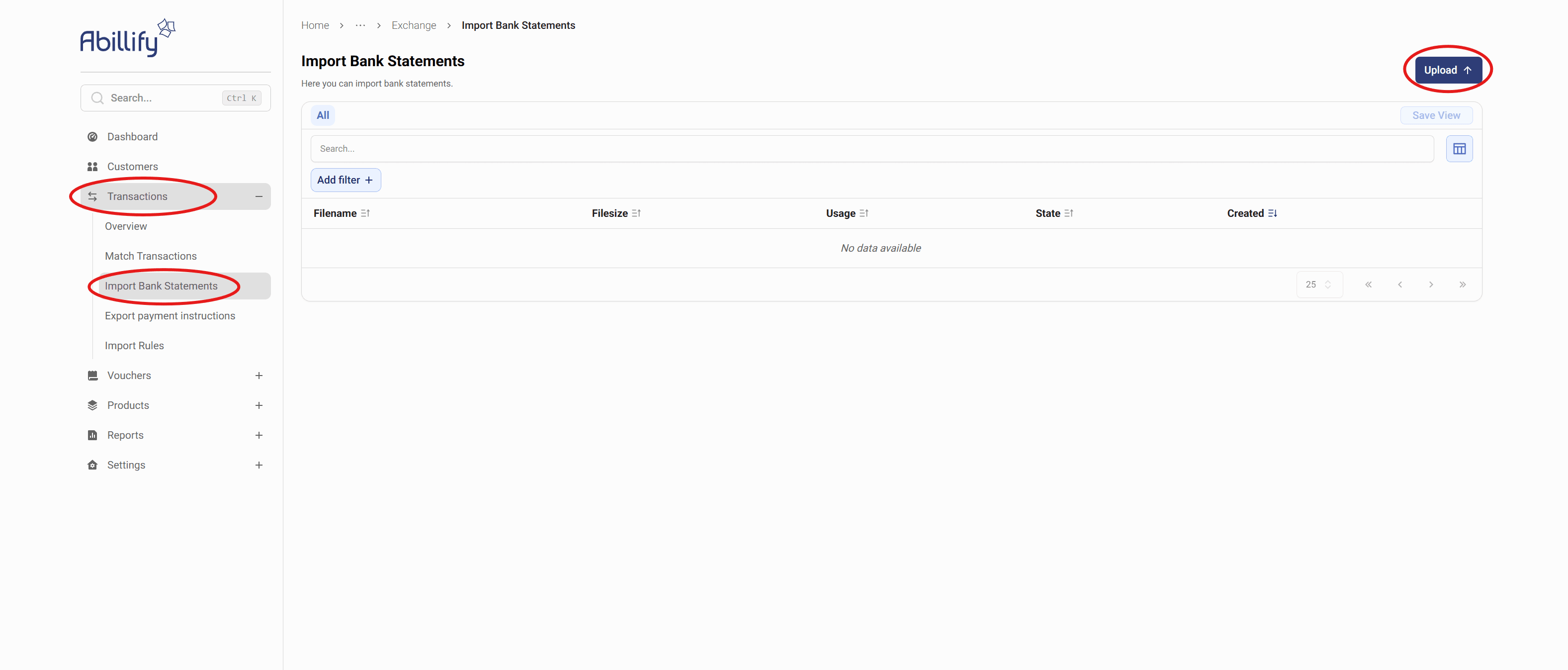 - Upload a bank statement (e.g. CAMT 53 & 54 in XML or MT940)